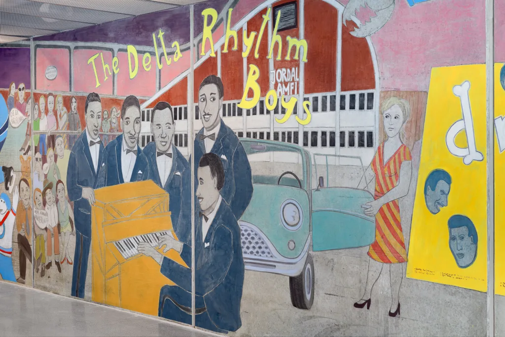 History Never StopsMural for the Nye Jordal Amfi Eishockeystadium Year: 202055 m x 2,5 mMural, mineral colours on conreteokk.kunstsamlingen.no